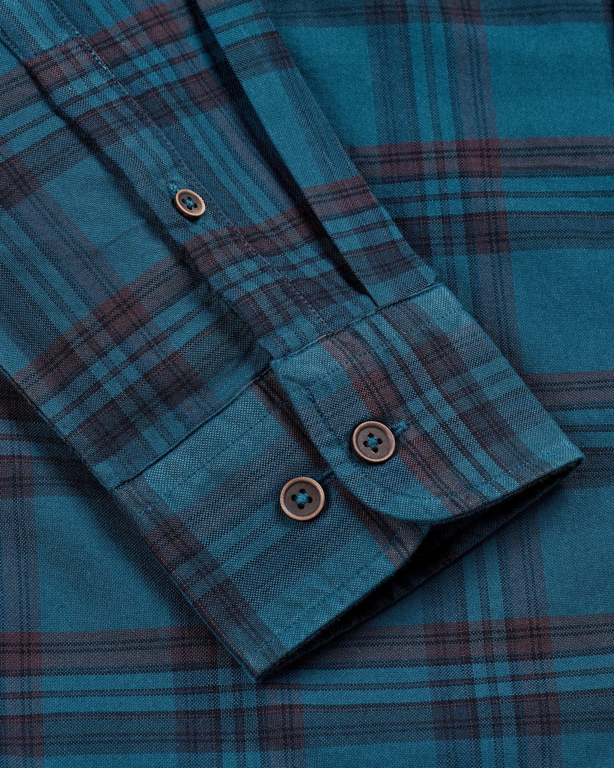 Bare Brown Checkered Cotton Spandex Shirt, Slim Fit with Full Sleeves - Teal