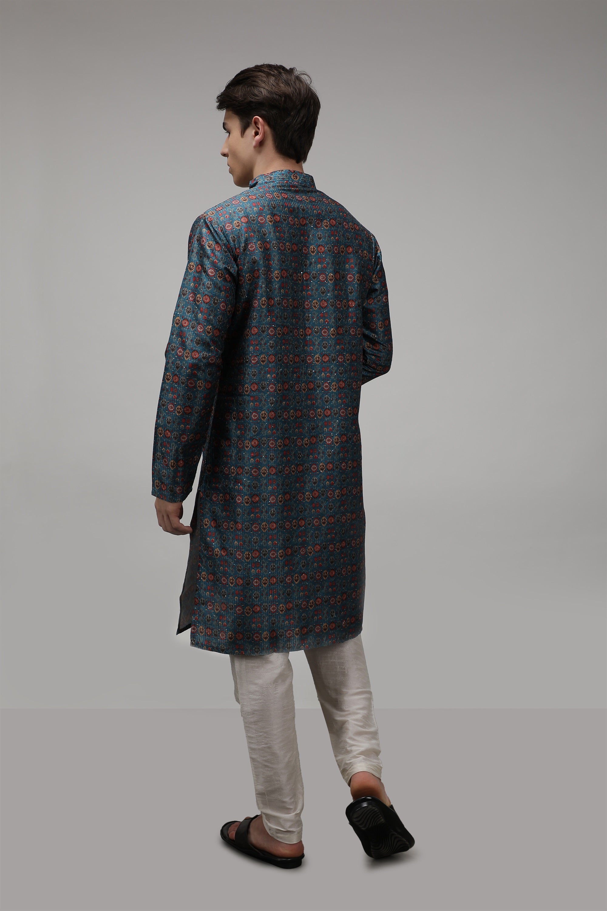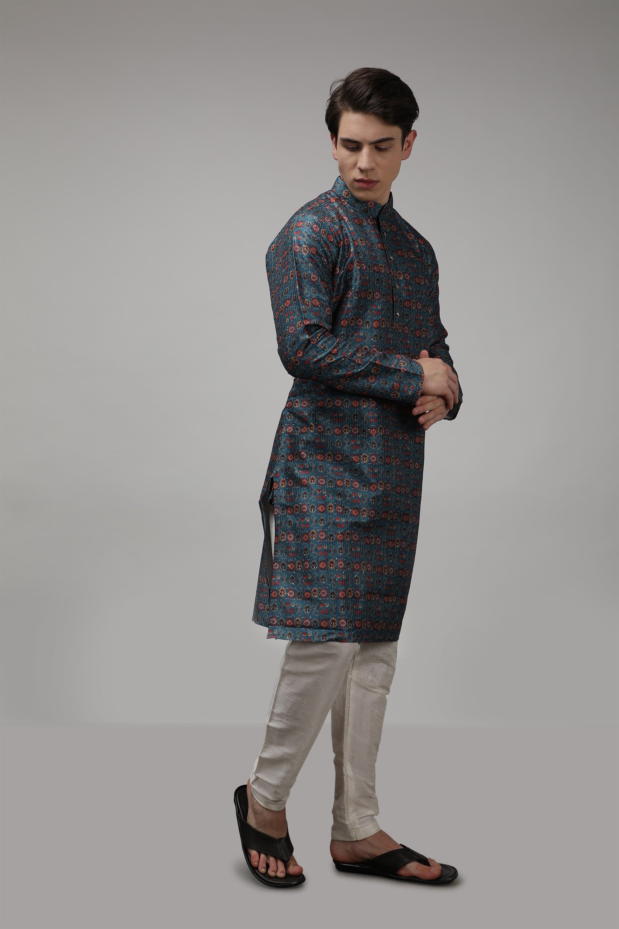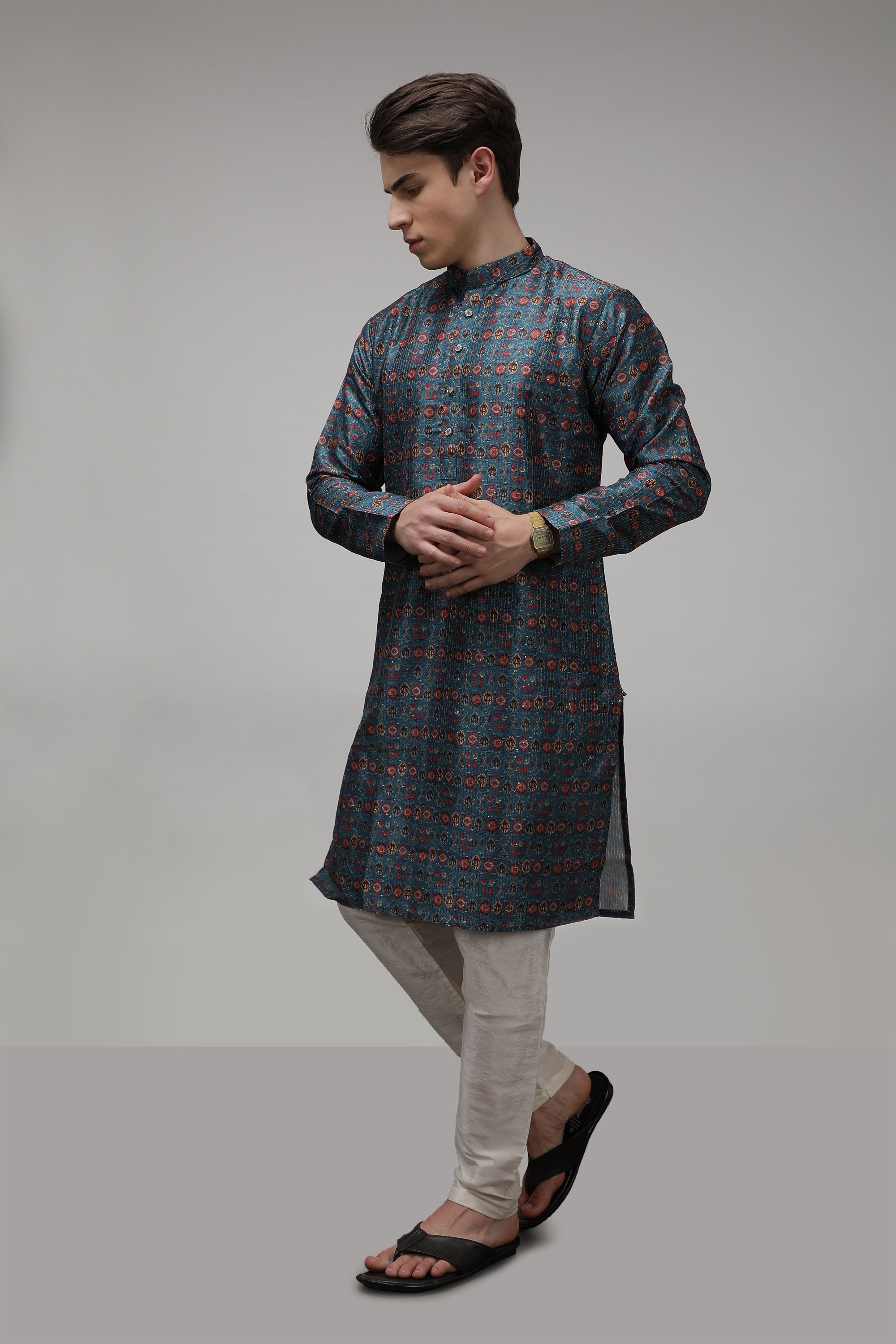 Thread Embroidered Printed Long Standard Fit Ethnic Kurta - Teal