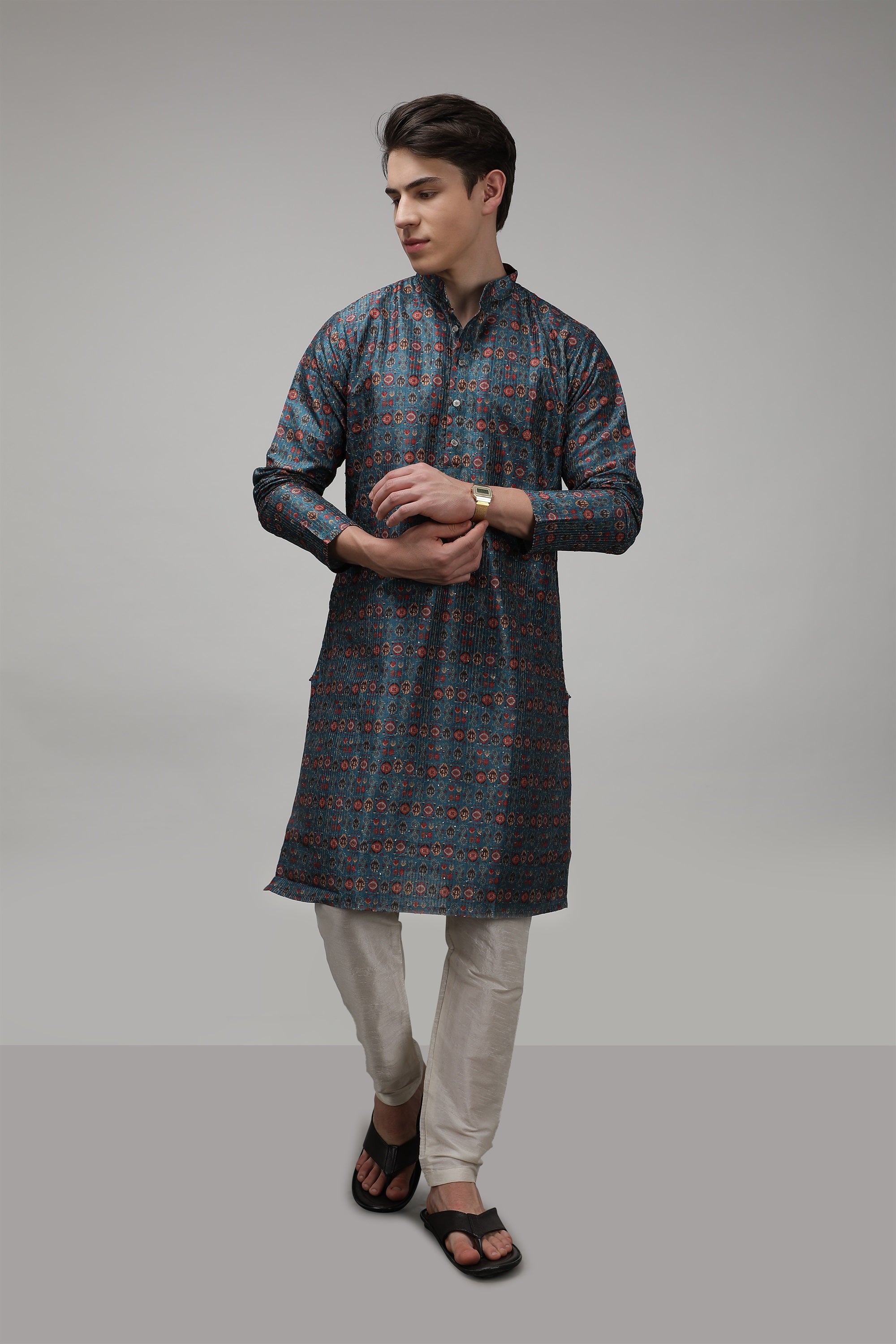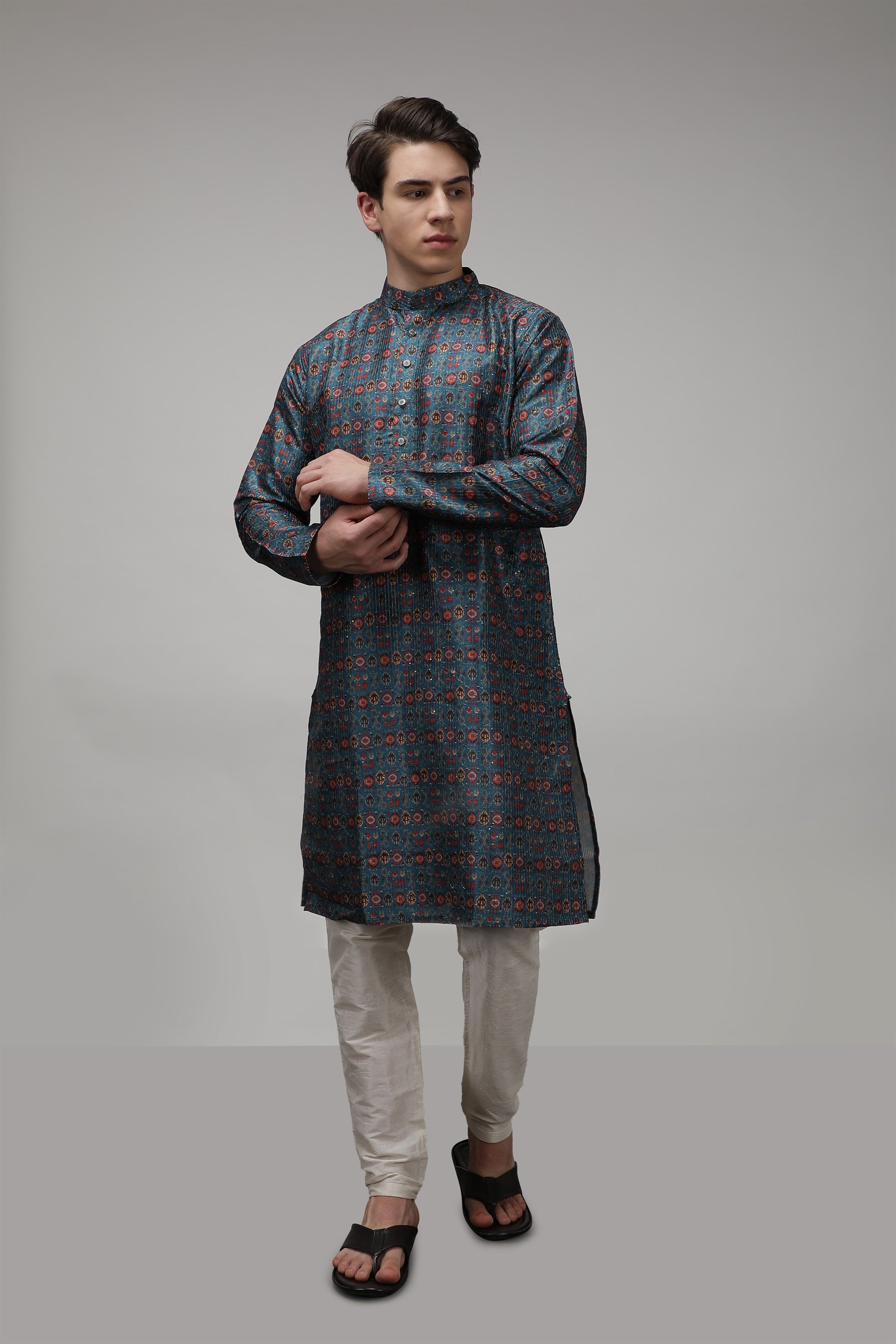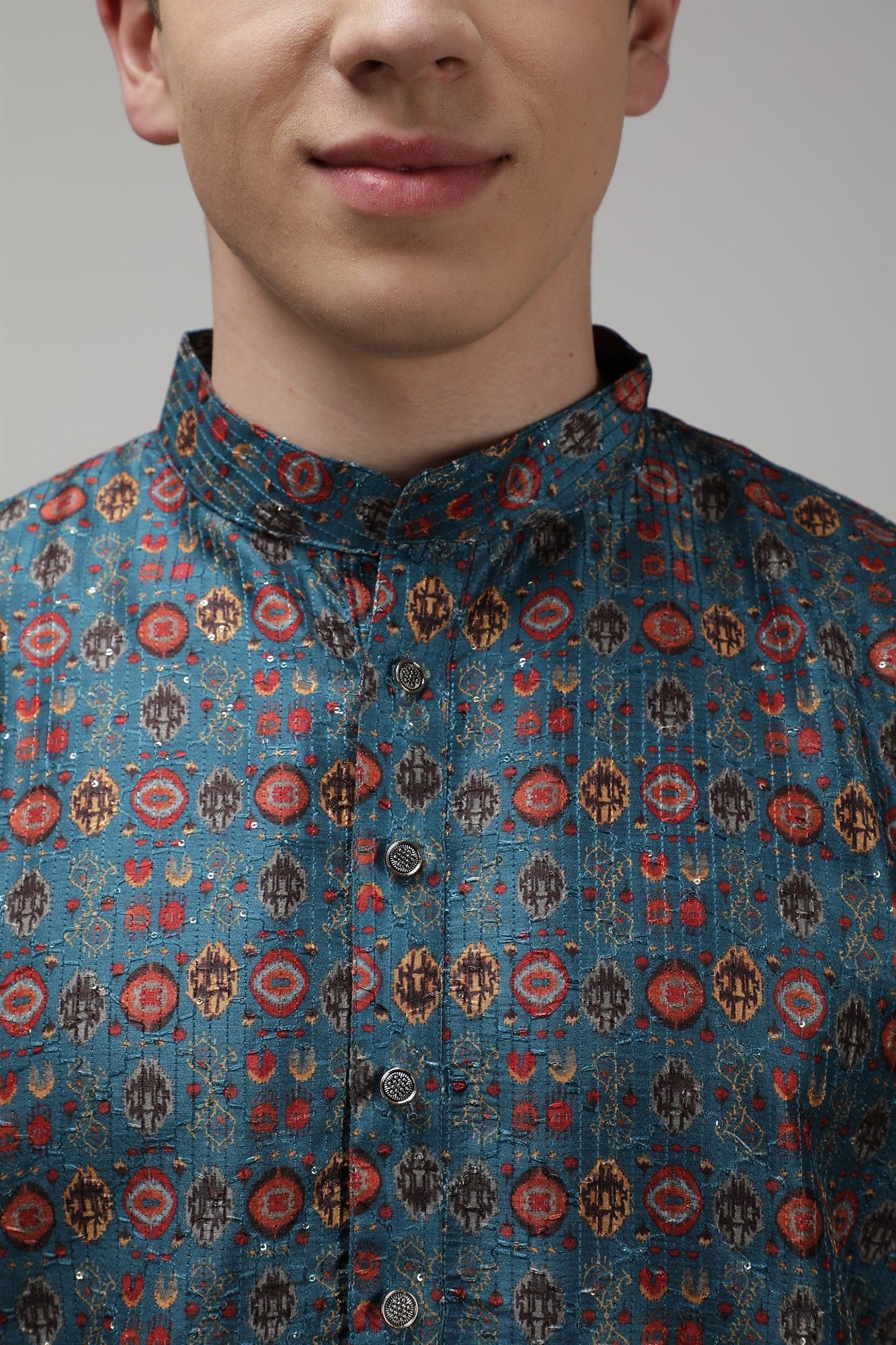 Thread Embroidered Printed Long Standard Fit Ethnic Kurta - Teal