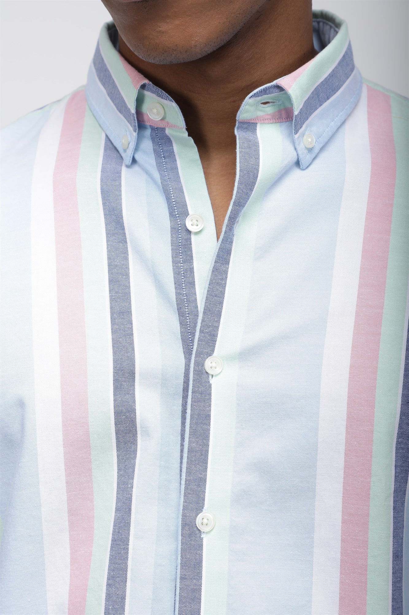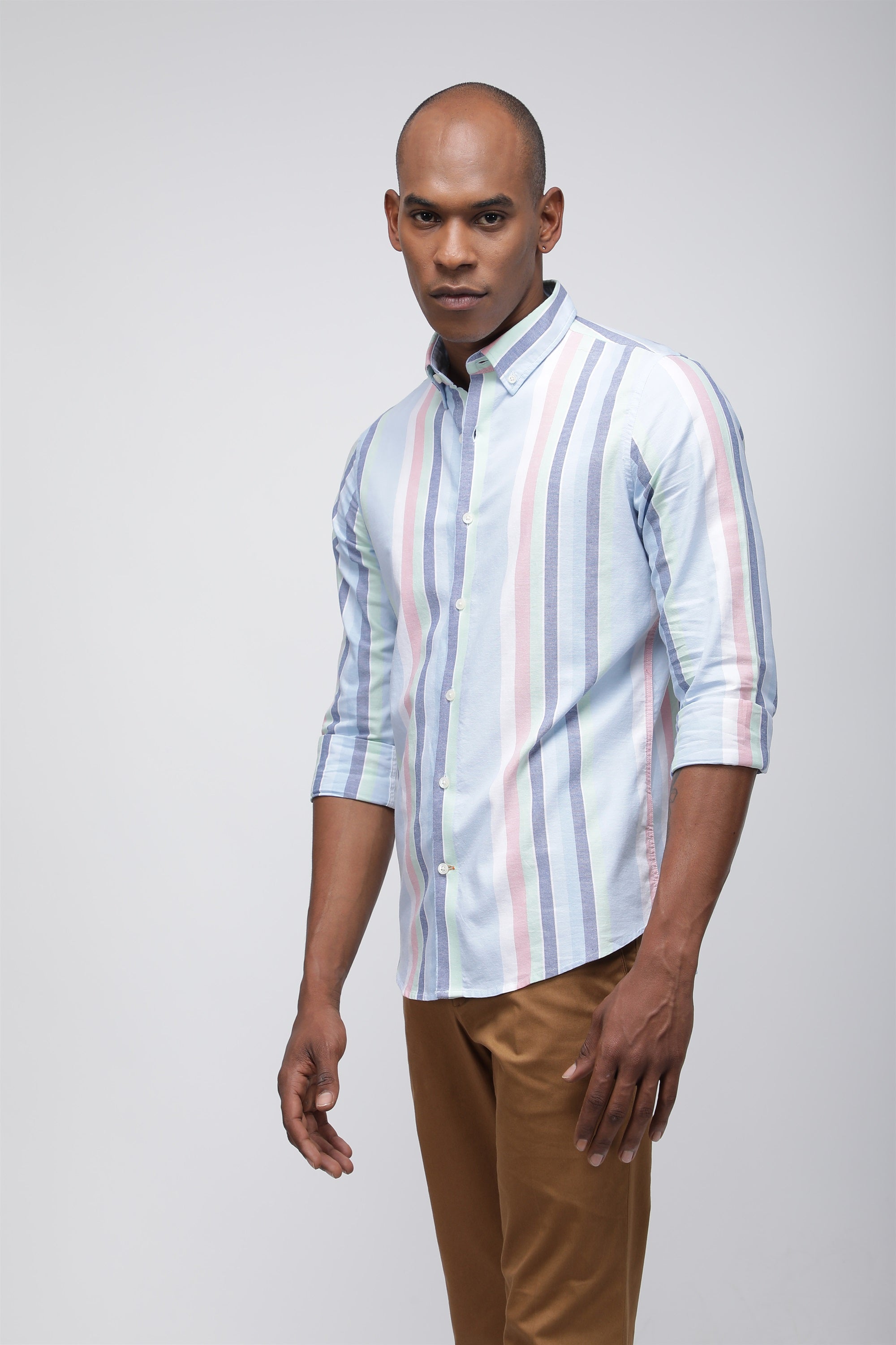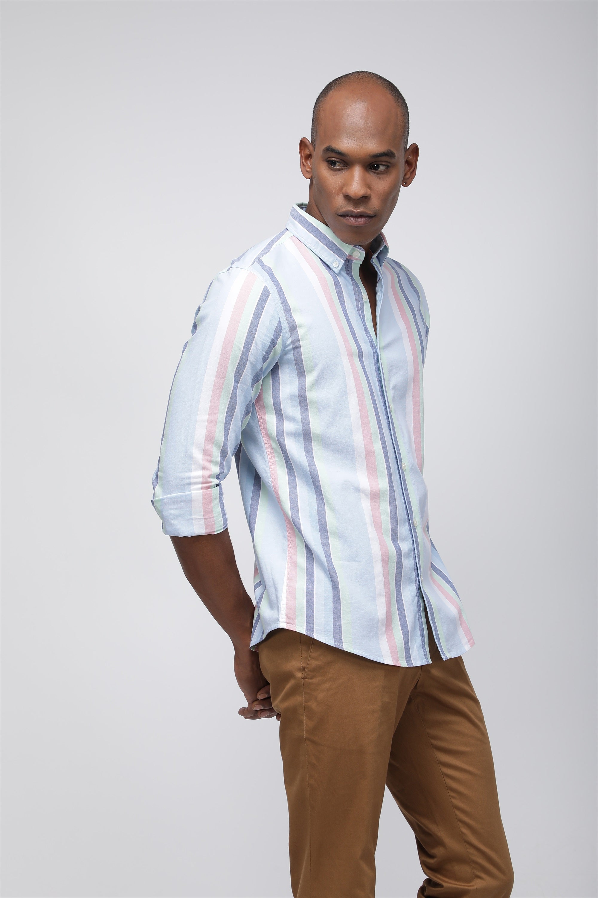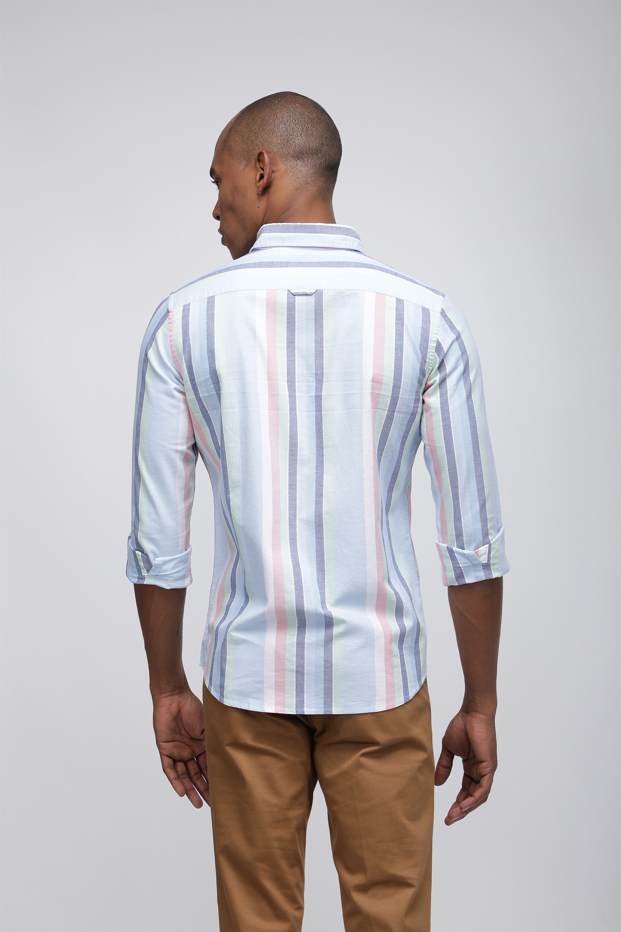 Bare Brown Pastel Striped Cotton Spandex Shirt, Slim Fit with Full Sleeves - Light Blue - Multicoloured