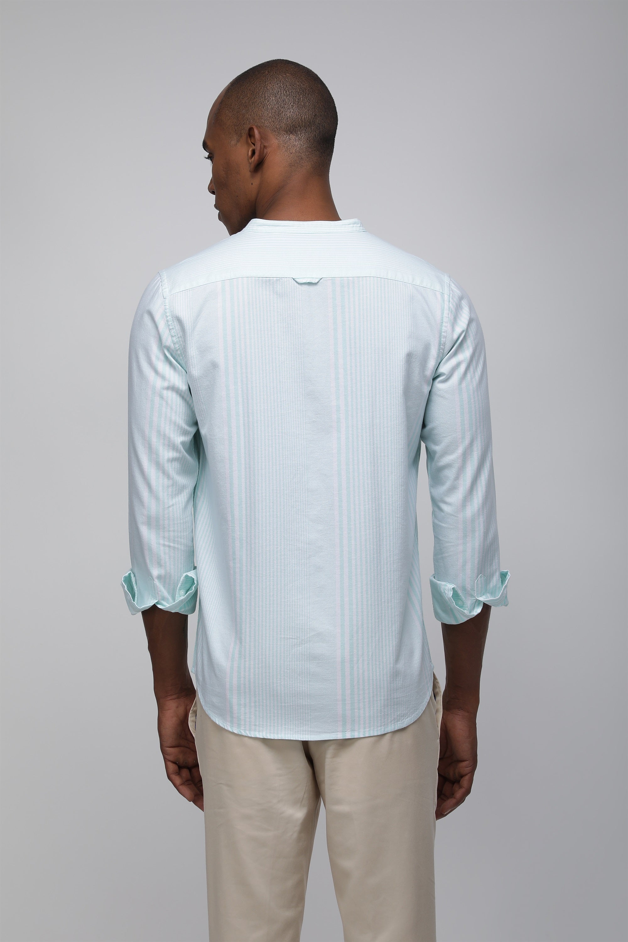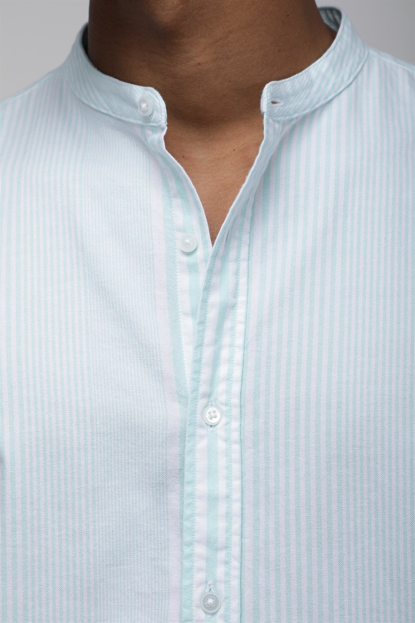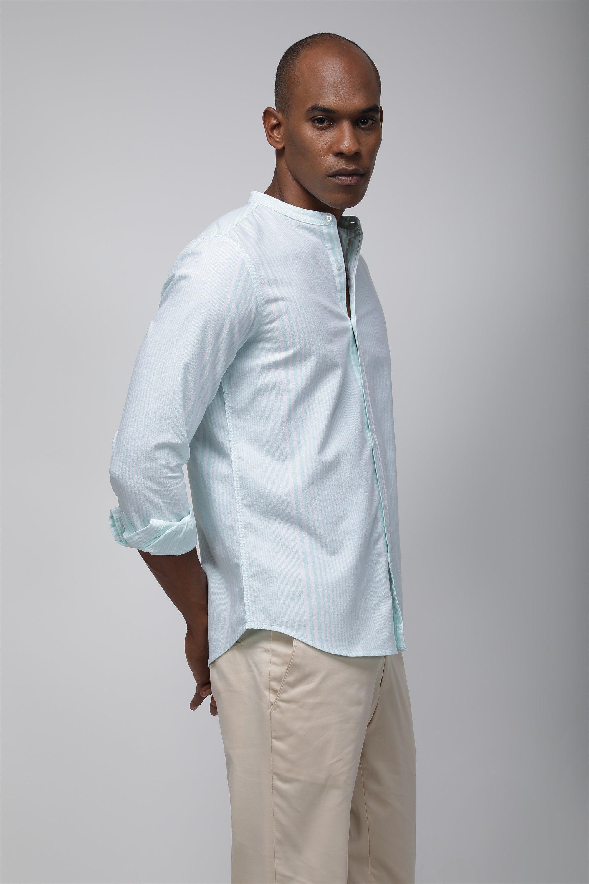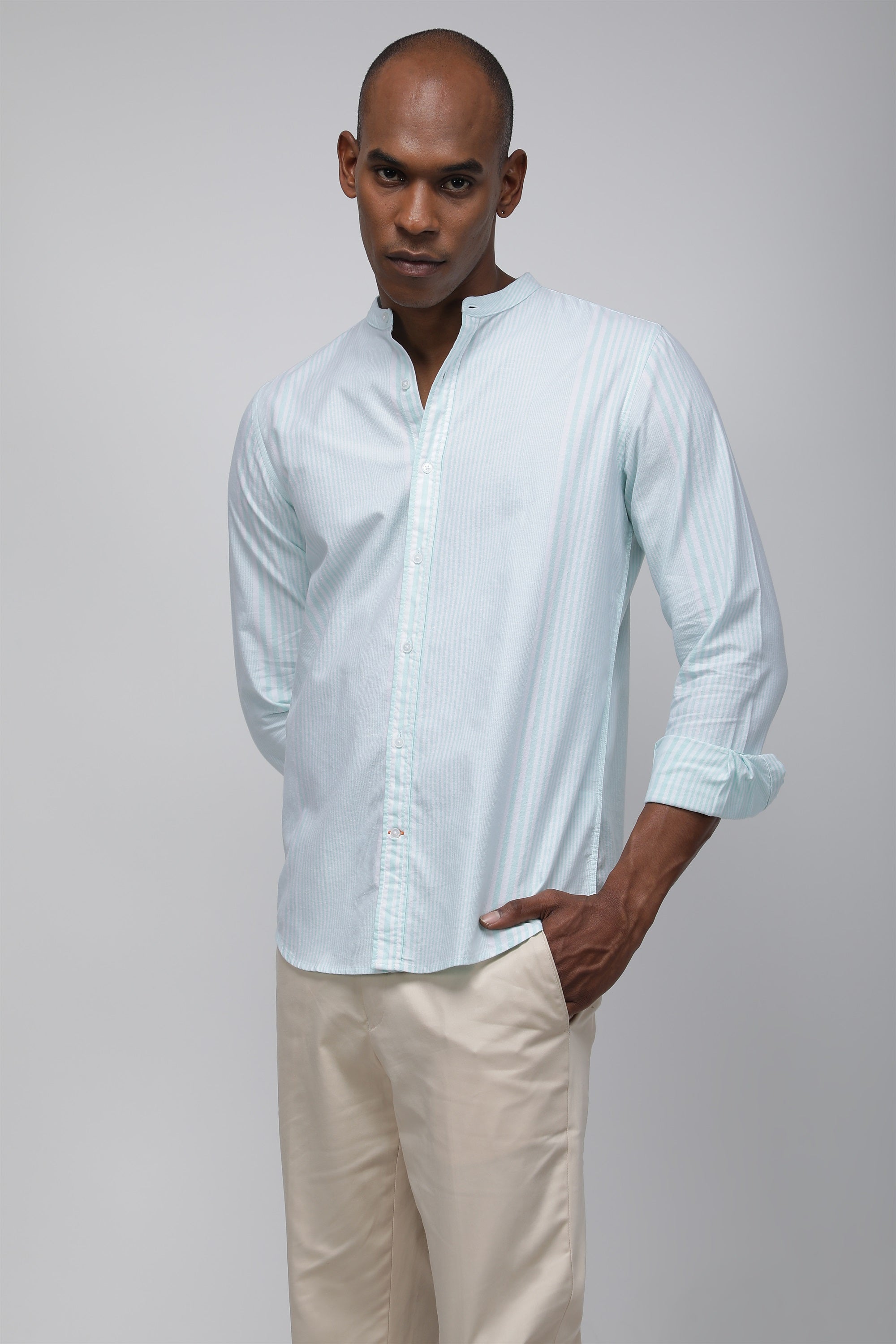 Bare Brown Striped Mandarin Cotton Stretch Shirt, Slim Fit with Full Sleeves - Green