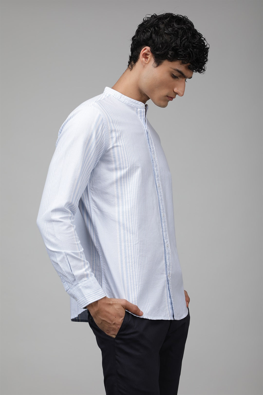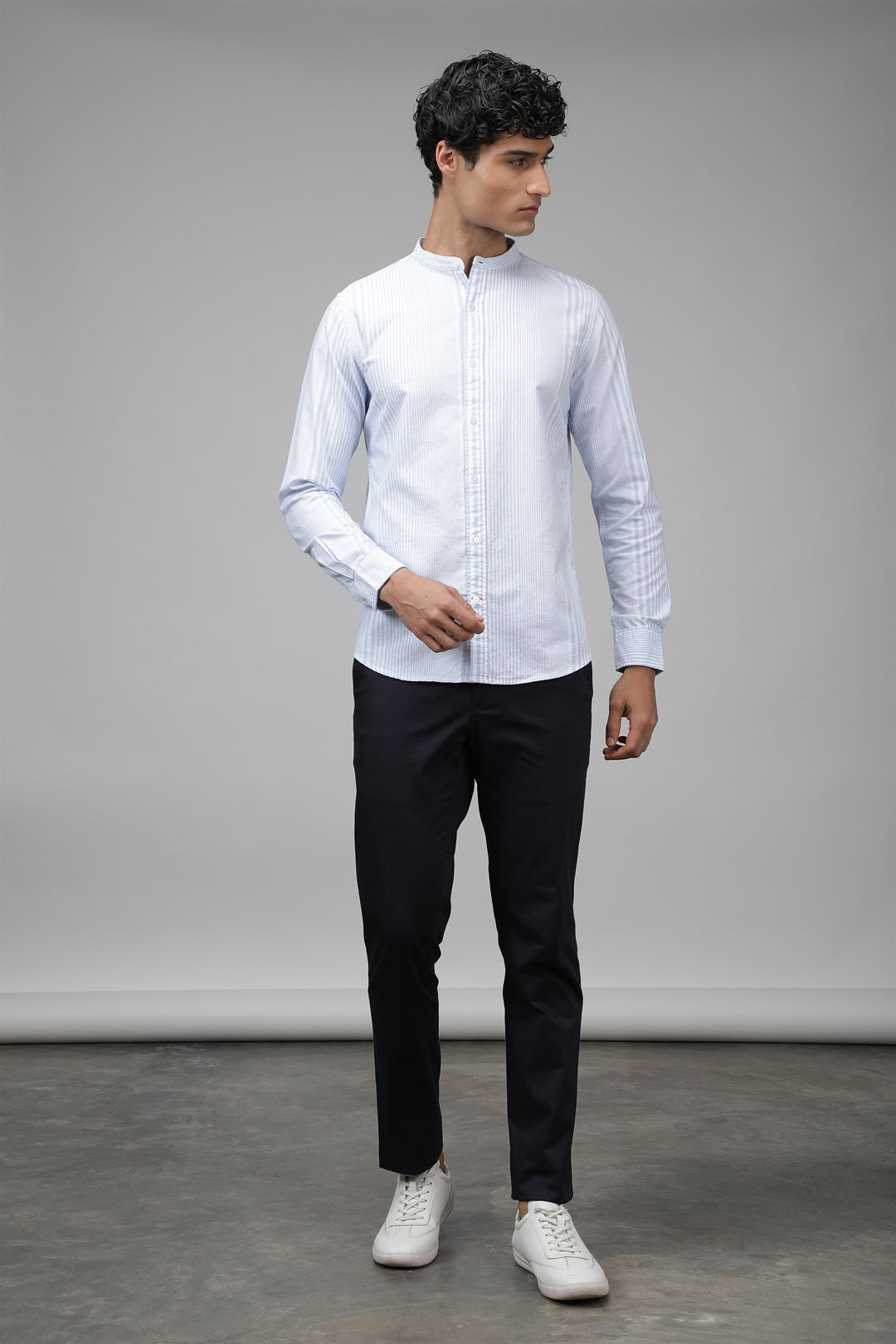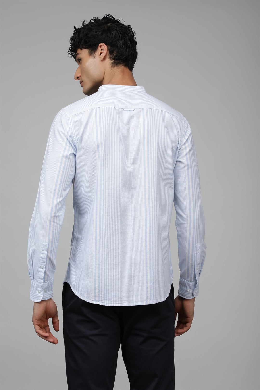 Bare Brown Striped Mandarin Slim Fit Shirt with Full Sleeves - Blue