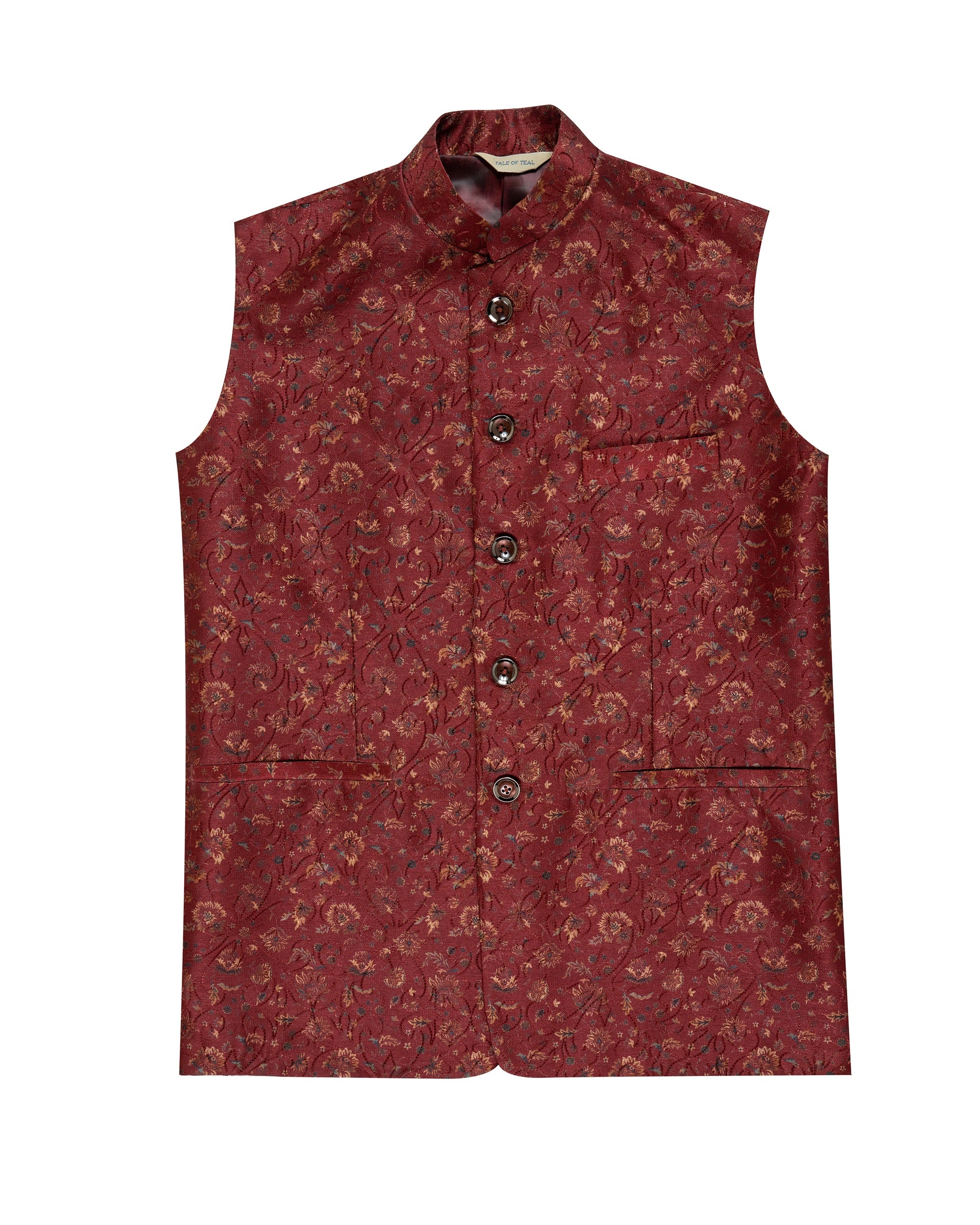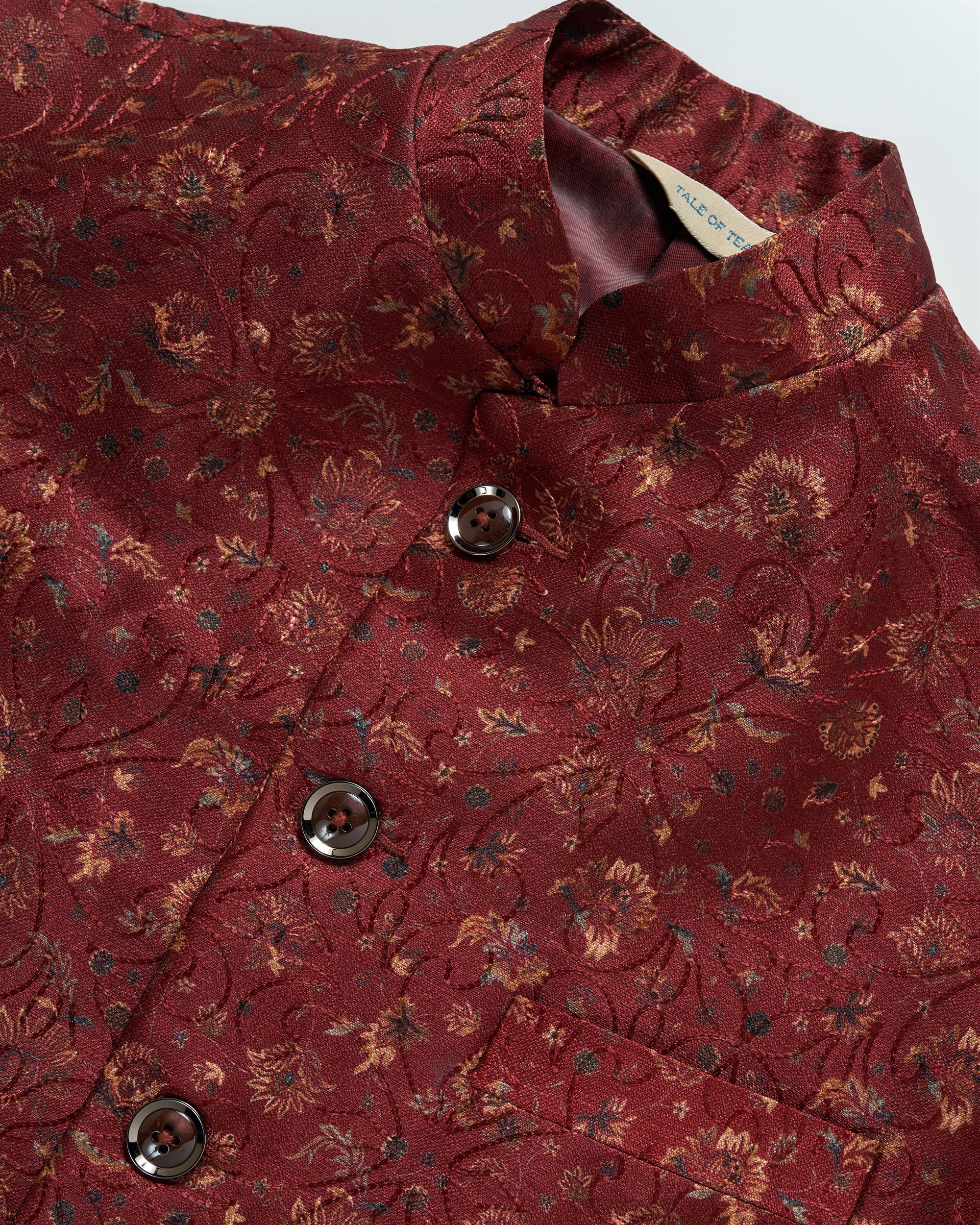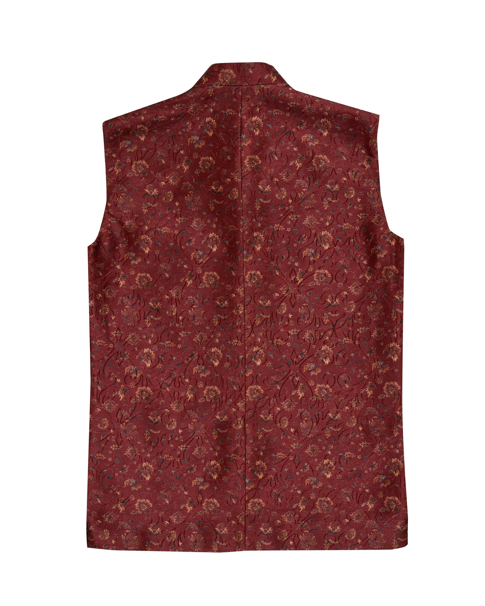 Tale of Teal Allover Patterned Thread Embroidered Bundi Ethnic Waistcoat - Maroon