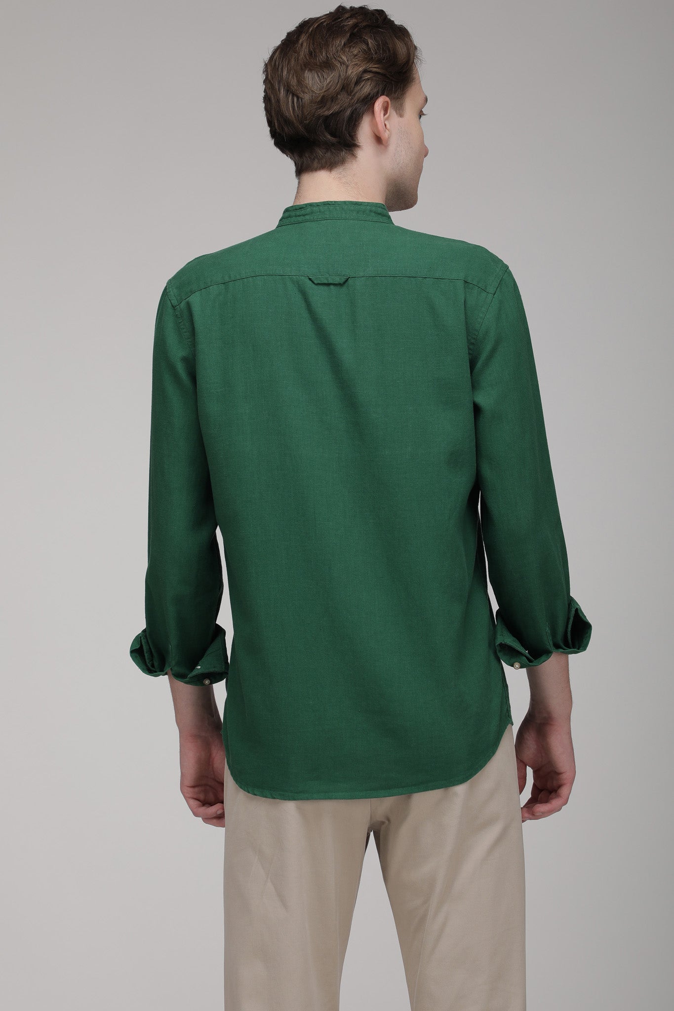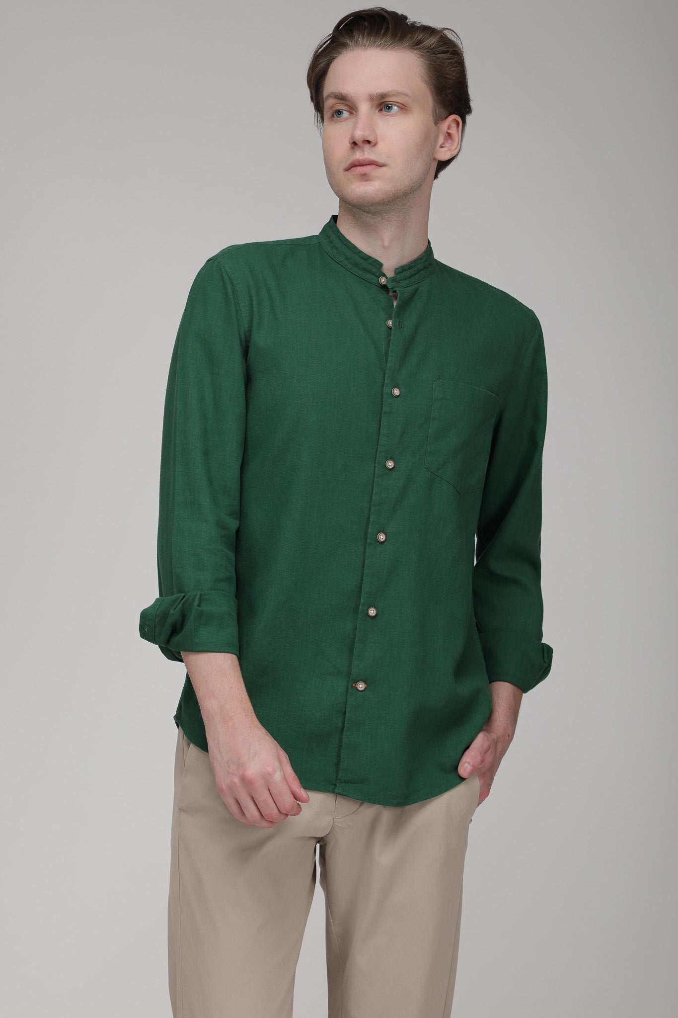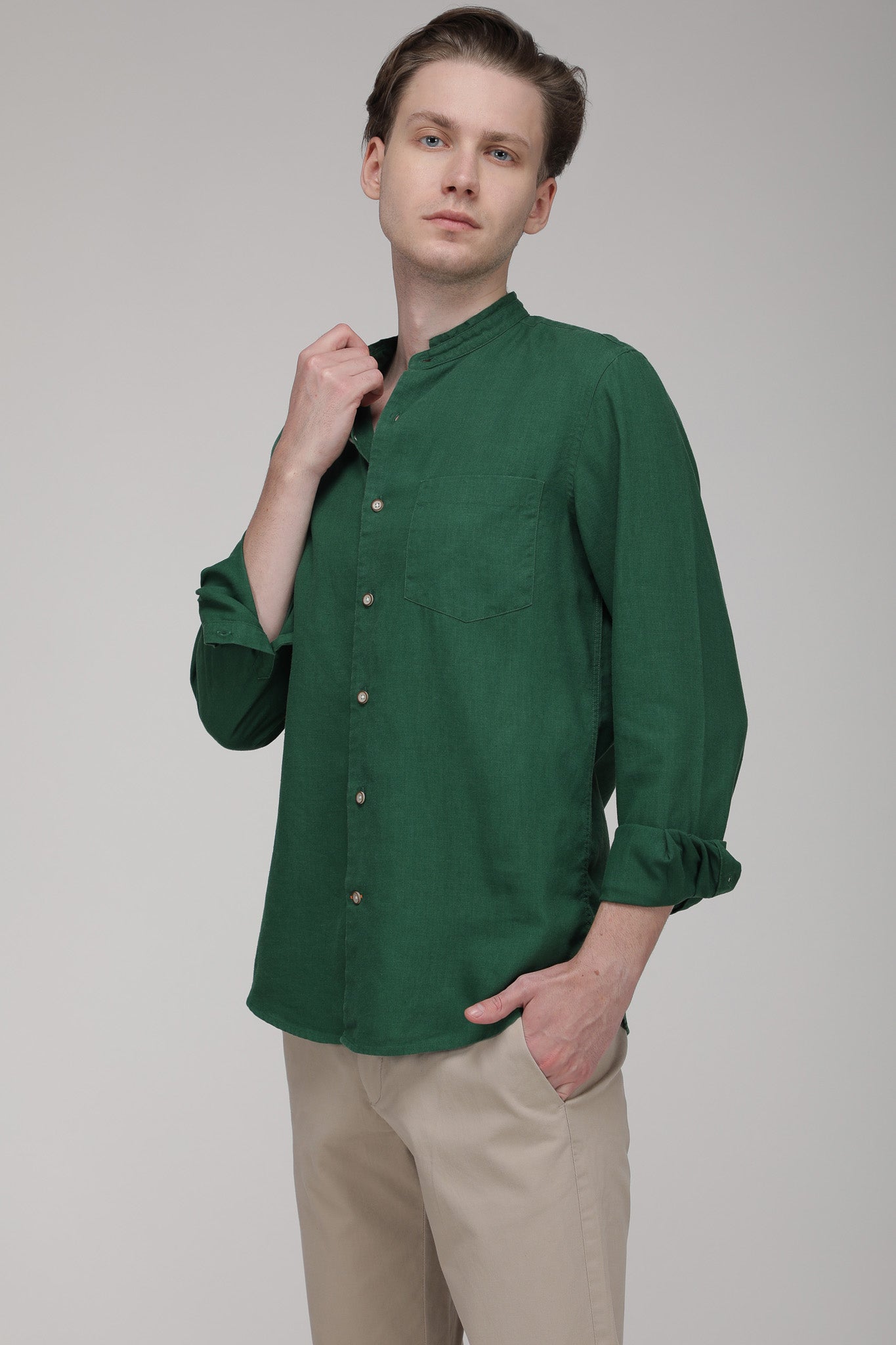 Bare Brown Mandarin Collar Cotton Linen Shirt, Slim Fit with Full Sleeves - Green