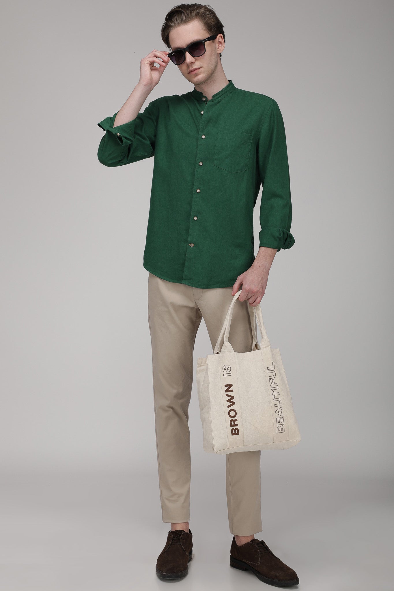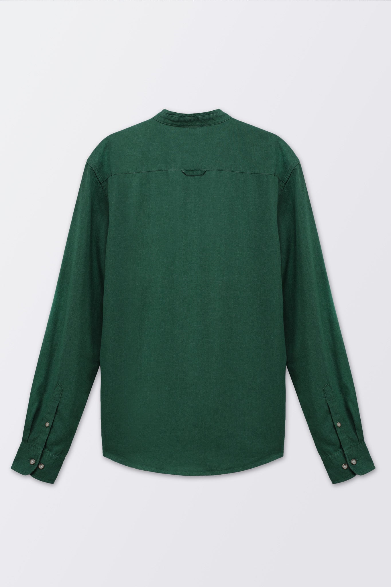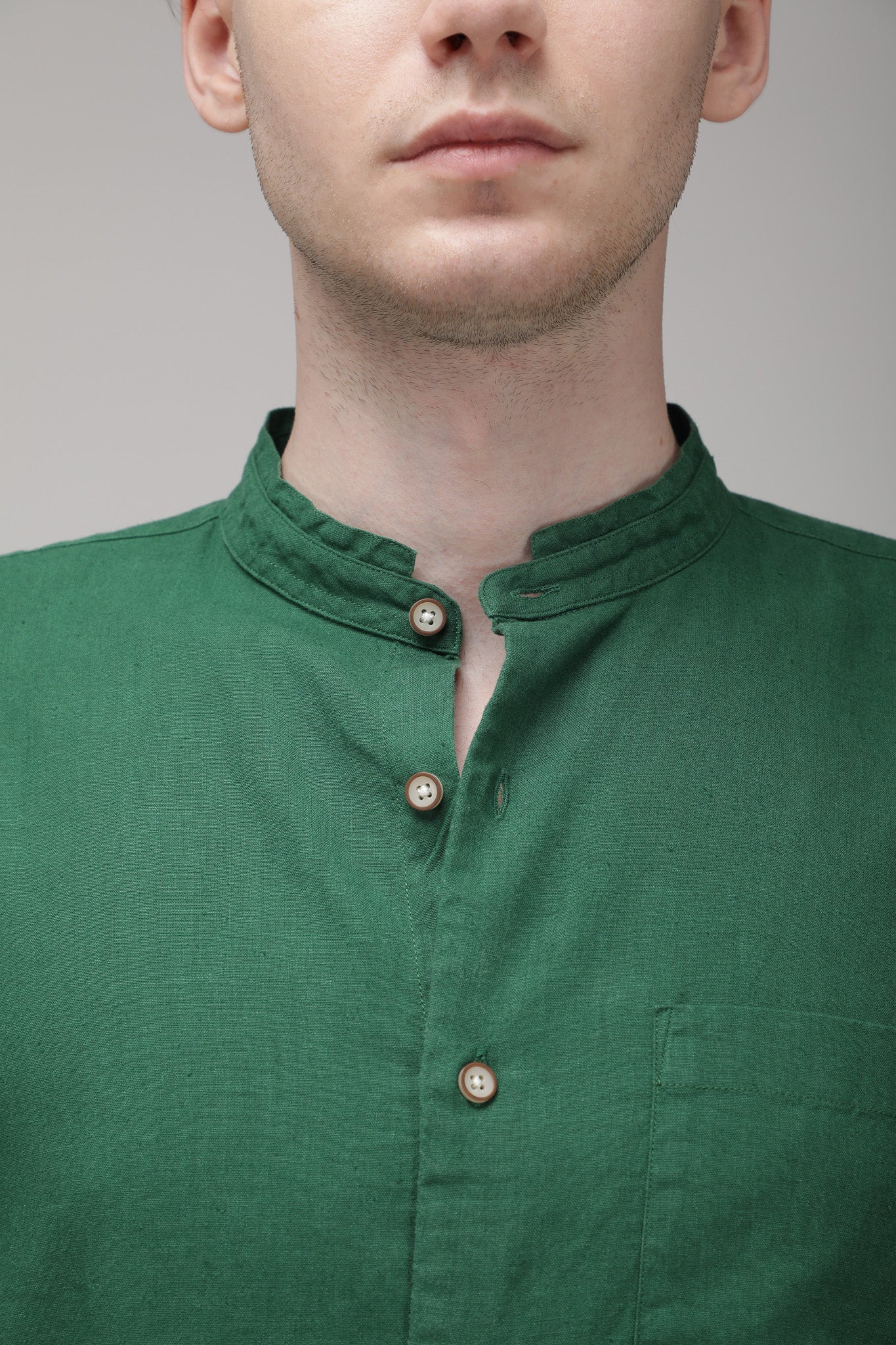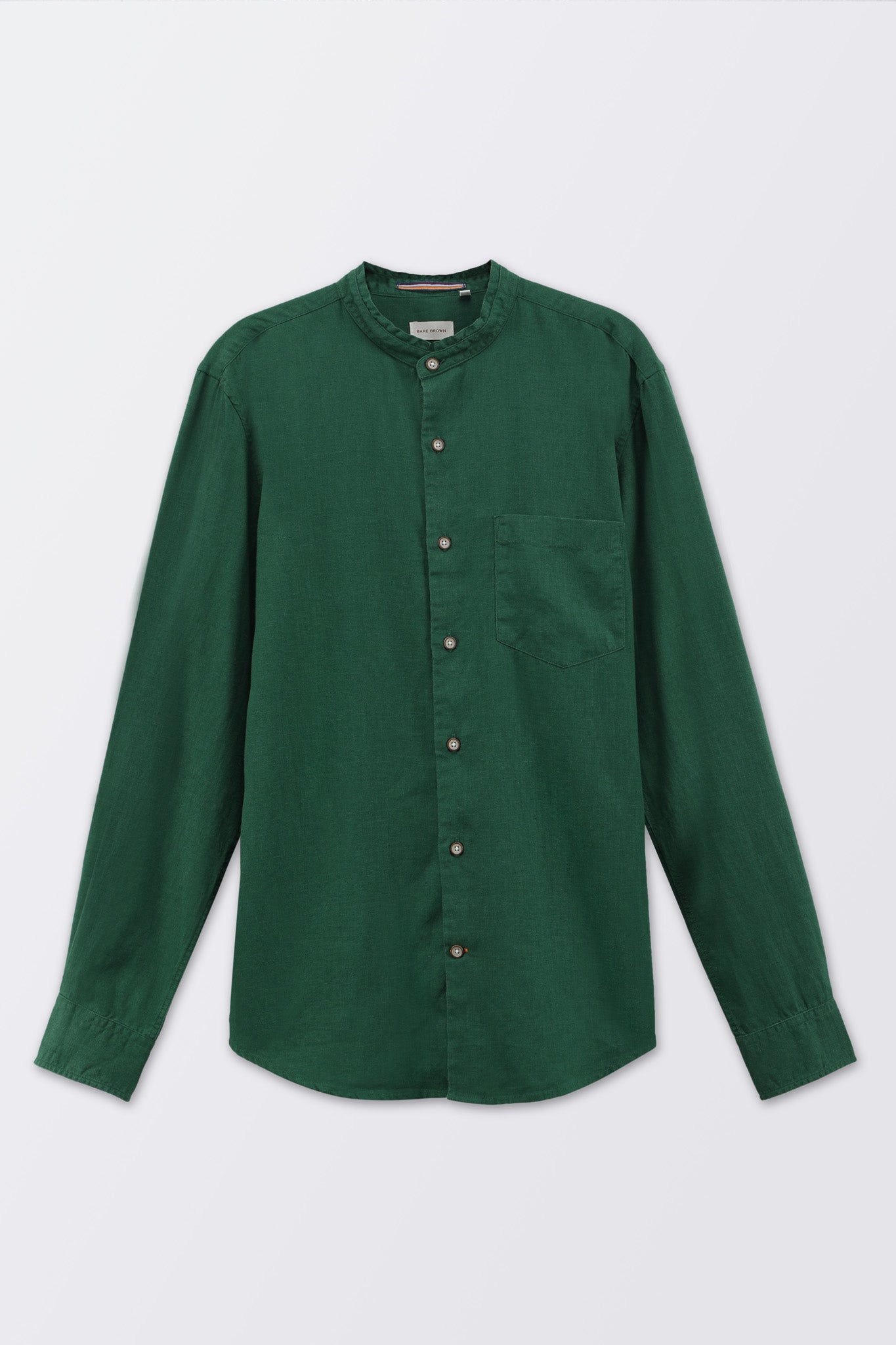 Bare Brown Mandarin Collar Cotton Linen Shirt, Slim Fit with Full Sleeves - Green